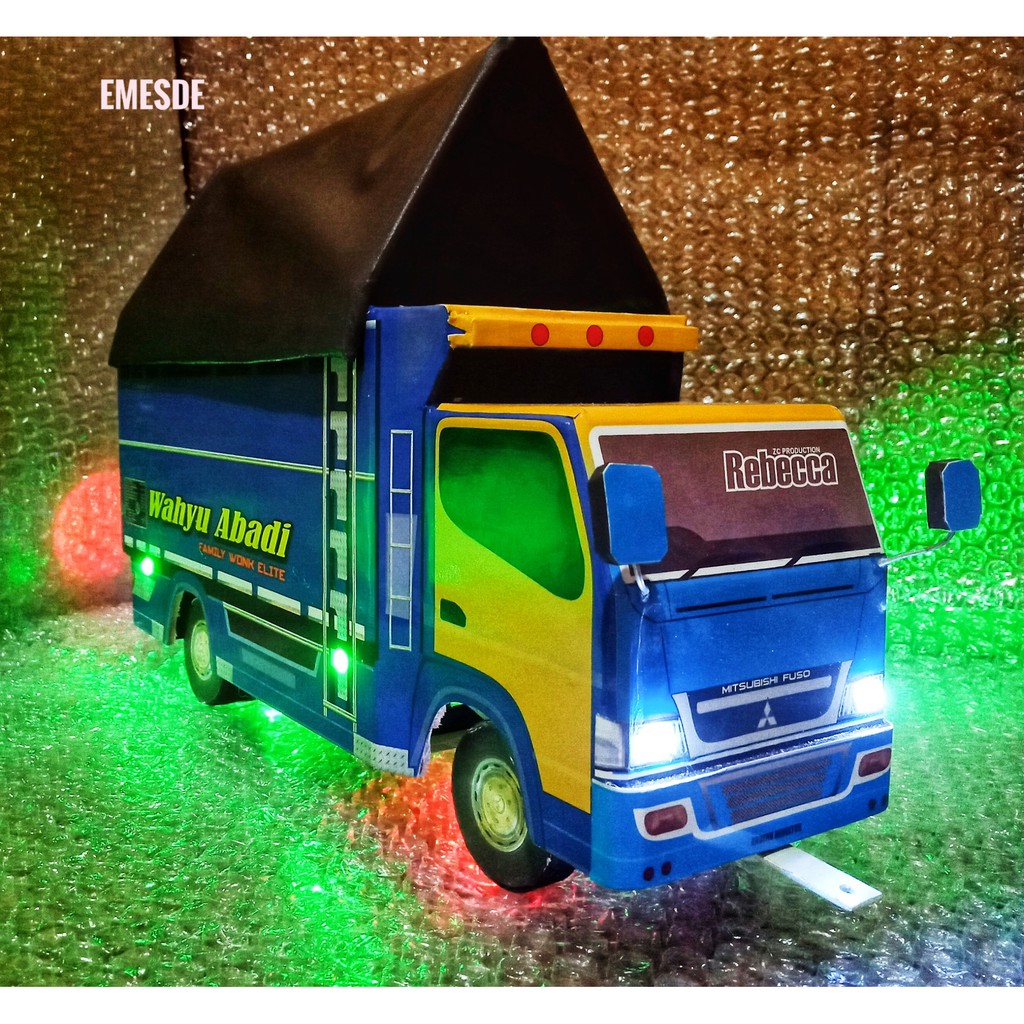 Miniatur truk berbahan triplek lapis stiker ukuran p45 l15 t20 roda muter no belok, pintu no bukaan ada beberapa variasi 1.tanpa lampu 2.variasi lampu 3.variasi.
